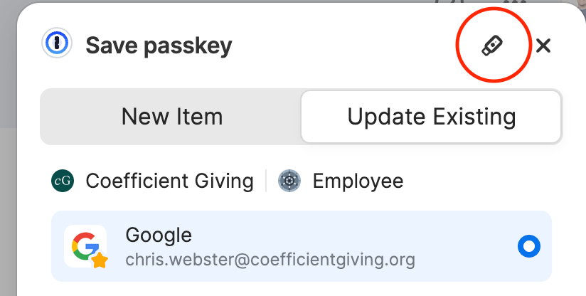 This is what it looks like when I go to “use a security key” with Google. 1Password intercepts this request. To use a physical key, I have to click the tiny little unlabeled Yubikey button (that tiny icon I mentioned earlier), which I’ve circled in red. Unfortunately it’s not circled in red in the real pop-up!